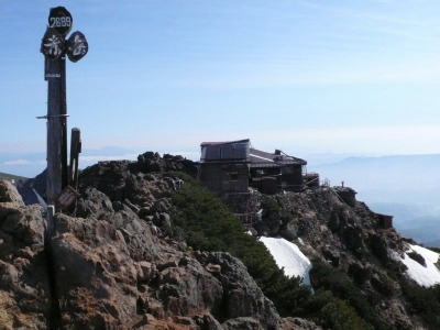 早朝の赤岳頂上と頂上小屋