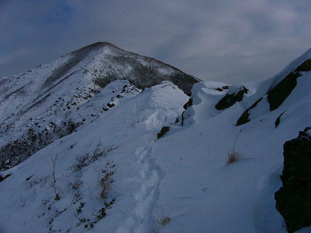 先行の3人は,13時30分,8合目で頂上をあきらめ下りてきた。無積雪期だと頂上まで15分の9合目に着いたのが14時で,太陽も沈みかかっていることから,引き返すこととした。