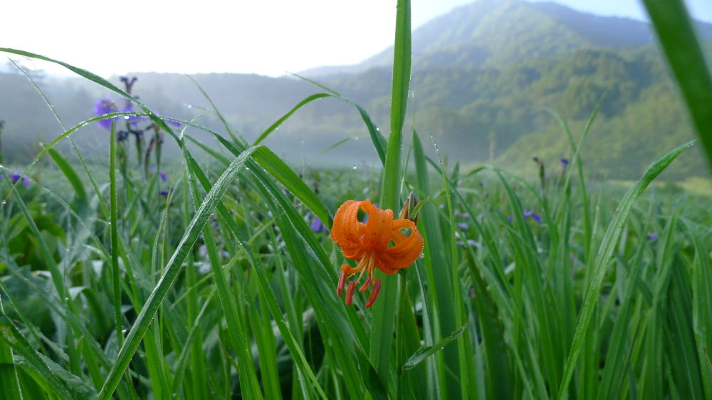 蓮華温泉から湿ってうっそうとした樹林帯を兵馬ノ平らへと下りる。早朝ながらすぐに汗びっしょりになり、陽当たりに出たらどうなるのかと先が思いやられる。湿原はアヤメ平と名付けられているとおりヒオウギアヤメの群落、そしてオオバギボウシが勢力を誇示している。そのような中、クルマユリがわずか2株あった。そのクルマユリは群衆の中の個性派と言え、その存在感を際立っていて、群れることは嫌いだと主張しています。