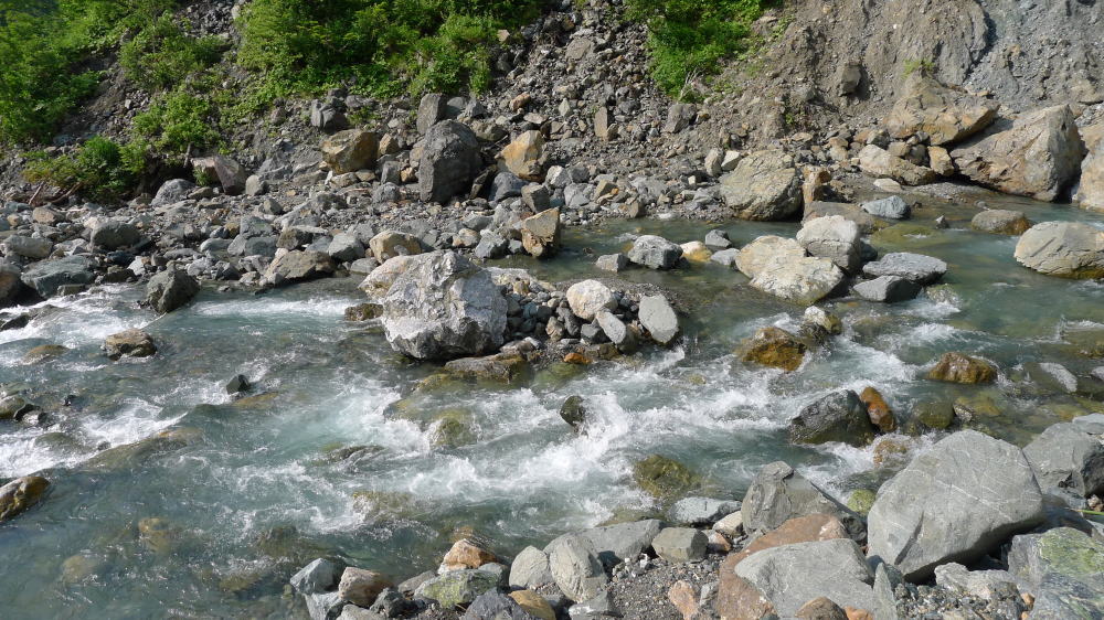 白高地沢に下りると丸木橋へ渡る右岸は大きく崩壊している。そこを通り抜けることができないわけではないが、先人の足跡も見つからない。下流に2011年中に供用が開始される予定の鉄製の立派な橋が架けられているが、まだ登山道で誘導されるようにはなっていないから、ダイレクトに渡渉することにする。この流れでは、どこかでは最低1回流れの中に登山靴を沈めないとならない。かと言って、いい加減に流れの中に足を置くと足を取られて転倒することは過去に経験済みだ。下の画像の右側を選んでどうにか通過したが、登山靴に水が入るのは致し方のないこと。そういうことで、登山地図上に記されている丸木橋が実際にこの上流に架けられてあったのかは確認していない。