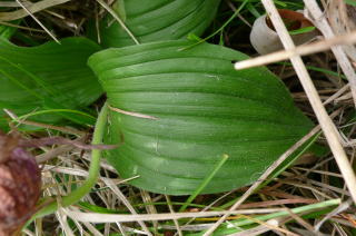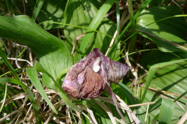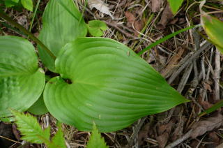 ふと立ち止まって周囲を見回すと、草の中にギボウシと違う少し毛羽立った柔らかい感じの葉があった。花ガラも付いたアツモリソウだ。2株が寄り添っている。