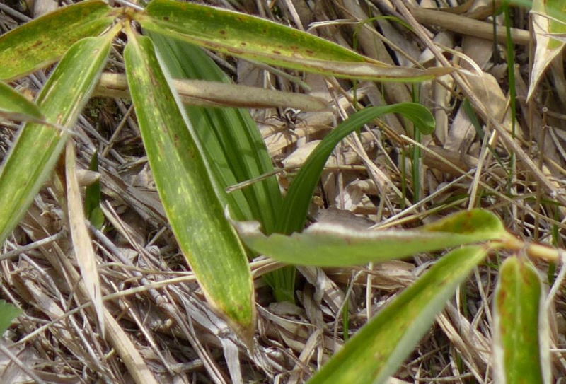 しかしながら、それらしきものはあった。笹に守られてひっそり佇んでいる。第一の場所のものより生育は遅れているようだ。中央の株の左側に幼苗も見える。これ以外のところも子細に眺めたが、下草が食害に遭って全滅状態で、他のアツモリソウを見付けることは極めて困難との結論に達した。
