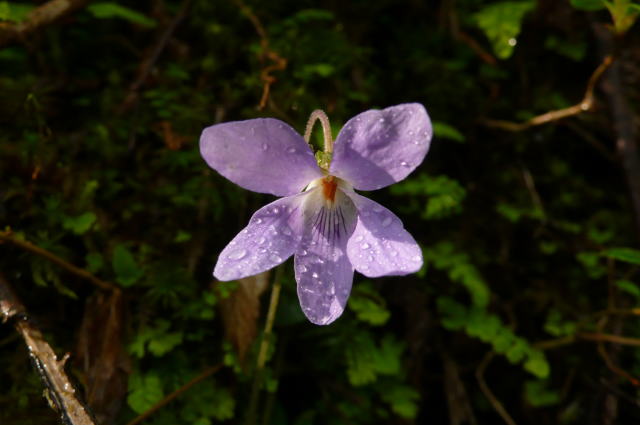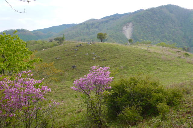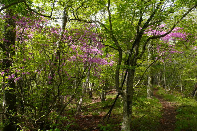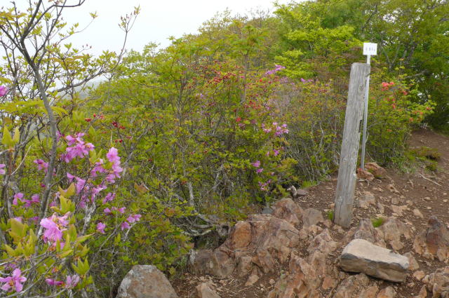 登山道脇に咲く花はまだ何もなく、スズランが花芽を出し、スミレがわずかにあるだけだ。1687mを巻く登山道脇にミツバツツジが華やかに咲いている。昨年2株あったササバギンランは掘られたようだ。土の凹みが二つ、せめて地表を均してはどうなんだろう。それとも盗人の誇示?これは他の高山植物の盗掘現場と同じだ。