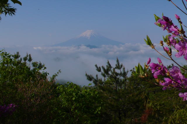 「ずっとここにいる?」まさか、夕べの雷雨をここでしのいだ?そんな疑問を持ちながら登山道に戻るともう男性の姿はなかった。狐に包まれたような気で先に進むと、木陰に男性数名がいて、バシャ、バシャとシャッターを切っている。その先は富士山で、手前にとてつもない大木のミツバツツジがあって、富士山撮影の好位置のようだ。雄大な富士山とミツバツツジの大木は想像を超える素晴らしい風景だった。(へなちょこのコンデジで写真家集団に近づくのは大いにはばかれましたので、No Photo!)