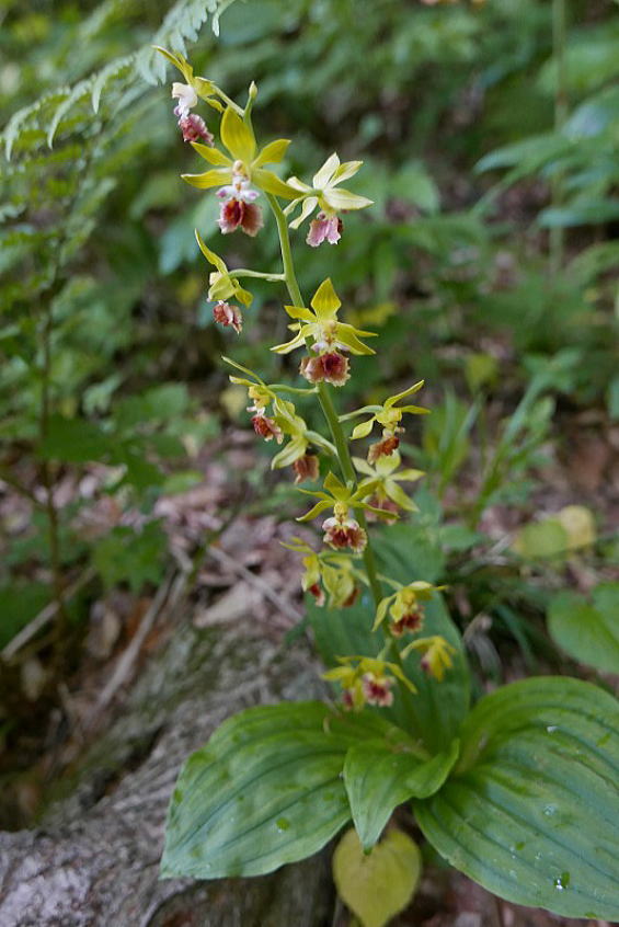 夜明けを迎えると雨は上がっている。登山口に向かうとまた雨で垣間見える山の上は厚い雲が覆っている。登山口の簡易トイレの掃除のための地元業者の車が上がってくる。今日はもうだめだなとあきらめて林道を下りようと車を走らせる。するとコケイランが林道脇で咲いているのが見える。ラン科の植物が花を着けているのだから、ほかに何かあるはずとサブザックに最小限の荷物を入れ、アプローチシューズを履いて散策に出る。そして結局お猿さんとの対面を果たすのであった。