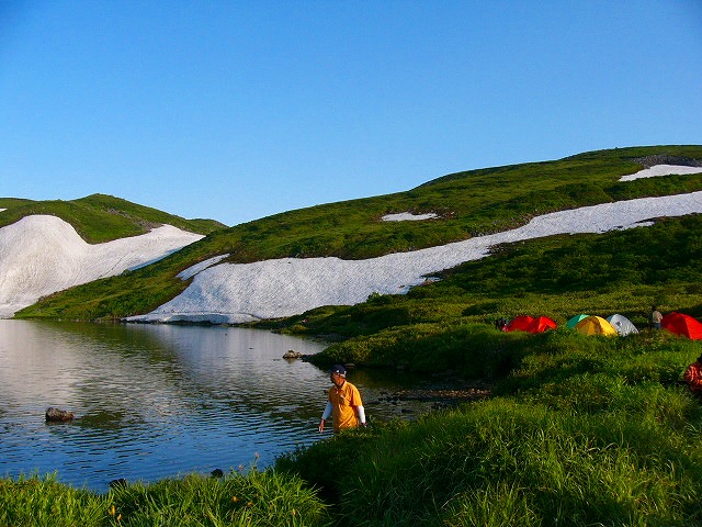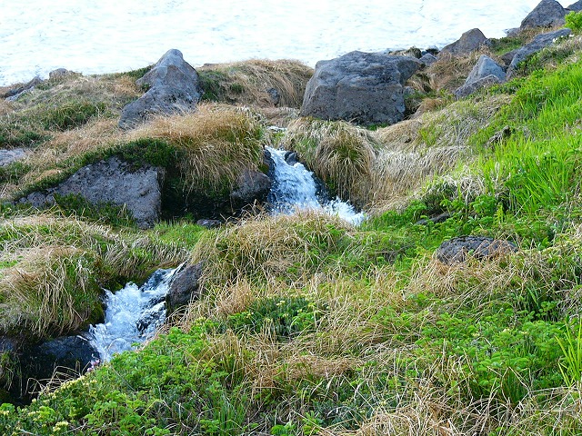 縦走する場合の問題点の一つは良質な飲み水の確保にある。しかし,北海道の山は,キタキツネの糞を通して引き起こされるエヒノコックス病や,登山者の排泄物の浸透により山の水が安全でないことは周知の事実となっている。ヒサゴ沼には,幾筋かの水が流れ込んでいるが,安心な水は,避難小屋及びテント場からトムラウシ山への道を雪渓をトラバースしながらしばらく進み,雪渓をしばらく登って,ほとばしるように流れから得る。ここの水は雪渓から溶け出したばかりのみずであり,当然のことながらとても冷たい。10時間も炎天下を歩いた身には,まさに命の水だ。