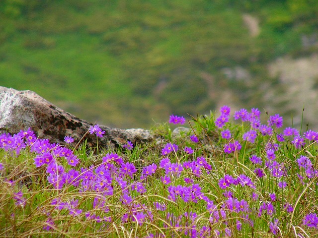 ただ,ここ第一公園では,その群落は小規模であり期待を裏切られた感を否めないが,第二公園ではチングルマの群落の中に,エゾコザクラが彩りを添えている。第二公園のエゾコザクラは,主に登山道周辺に沿って咲いている。シナノキンバイソウの黄色の花とともにお花畑を作っている。