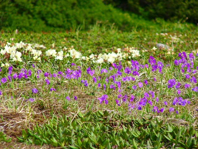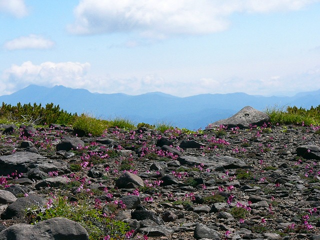 平ヶ岳を越えて高根ヶ原分岐を過ぎたあたりまでは旭岳を背景にコマクサが点々と咲いている。この間は,コマクサのほかホソバノウルップソウ,リシリリンドウ,チングルマなどの高山植物が咲く場所であるが,それぞれの花の時期には合っていなかったとみえ,特に印象に残る花は見られなかたった。岩混じりの登山道をさらに進むと,草つきのゆるやかな上りとなり,エゾコザクラやヨツバシオガマ,エゾツガラクラが美しい。