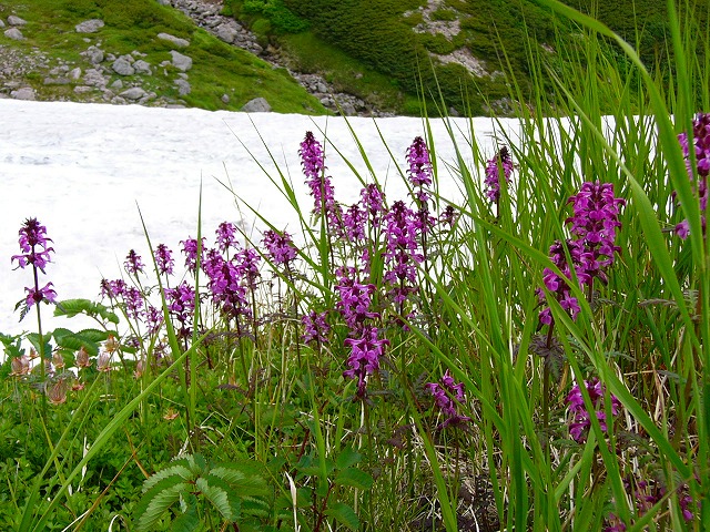 白雲岳避難小屋近くの雪渓脇に咲くヨツバシオガマ