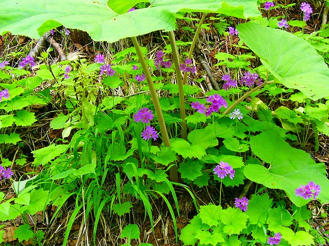 伏美岳登山口先 最終水場の斜面に咲くエゾオオサクラソウ 稀少な白花も見える