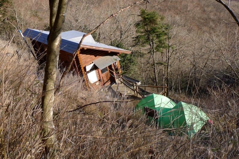 当初、全員が小屋に泊まると言っていたが、ほどなくして大きなエスパースのテントを2つ小屋の玄関前に設営した。通路も塞いだので、水場への通行は肩崩れした脇を通るほかなかった。そこで、「テントは、稜線でそれとなく張られているようですよ。」と水を向けるも、その意味するところをこの人たちは理解できないようだった。