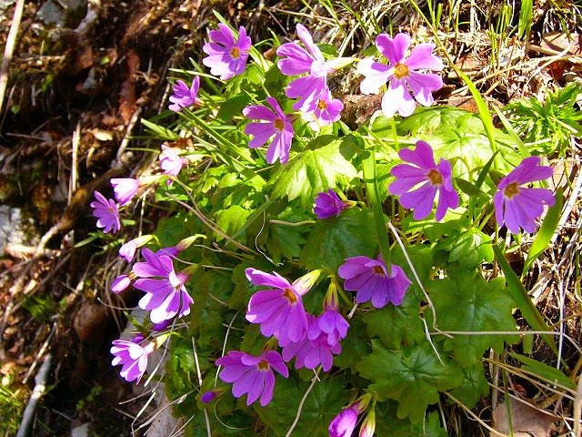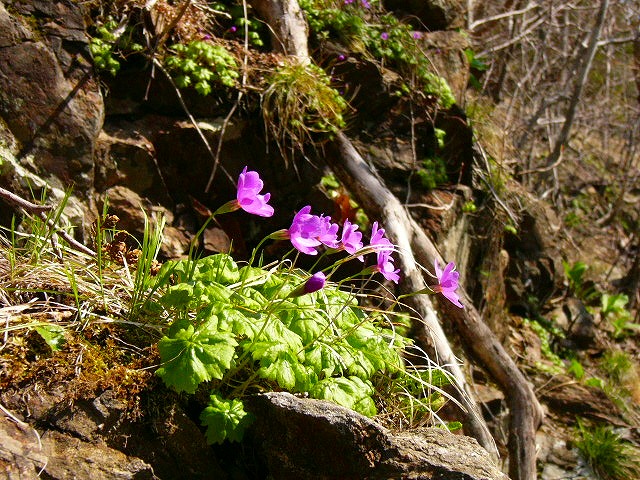 結構奥に入ってきてしまった。ヒダカイワザクラの花は途切れることなく見られるが,だんだん心細くなったこともあって,林道に戻ってしまった。