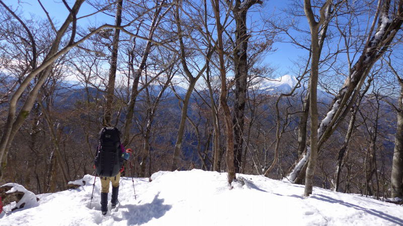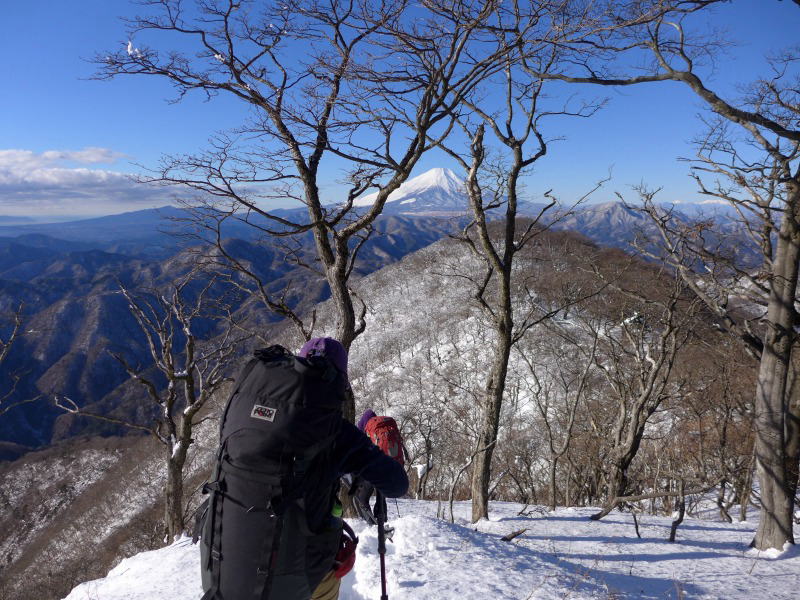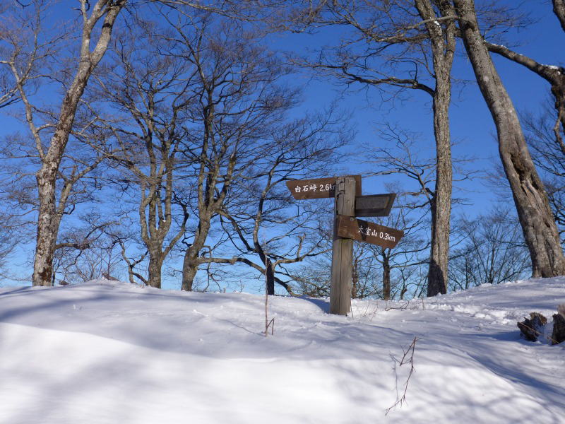 単独氏はゆっくりと起き出してきた。氏に別れを告げ、小屋裏からの大室山への急登に取り付く。夏道なら1時間40分のコースを2時間かかって頂上分岐に至る。分岐から加入道山方向への斜面に足跡が伸びているが、途中で戻ってきていて、その先にトレースはない。膝頭まですっぱりと埋まってしまう新雪を漕いで道を付ける。