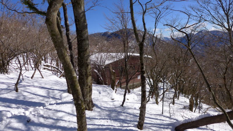 稜線の登山道から少し下りたところに建つ加入道山避難小屋に立ち寄って、ザックを下ろし一息つく。このときにはすでに衆議一決し、当初予定の畔ヶ丸までは足を伸ばさず、エスケープルートとして用意してあった白石峠〜用木沢出合のルートで下りることにしていた。このルートで下りると夏道2時間程度のコースタイムではあるが、雪でコンデションが悪いので余分に時間がかかるだろうが、畔ヶ丸までの稜線に降り積もったであろう雪のことを考えると、最善の策である。