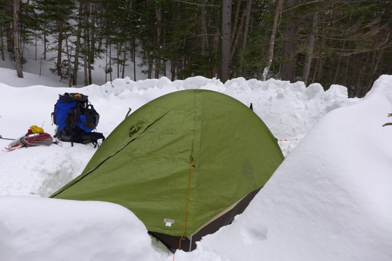 その場所には本沢温泉が客を送迎する四輪駆動車を走らせる道を往復したと思われるワカンの足跡があり、そのワカンの足跡は谷へと入って下りて行っているので一度引き込まれてしまったが、道迷いの結果のトレースと判断して登り返すと、夏道と思われるところは積雪で厳しい斜面のトラバースとなった。どうにか2か所のトラバースを過ぎるとほどなくして本沢温泉のテント場であり、イグルーの壁だけといった風情の雪が積まれていて、わずかな整地でテントが張れそうだった。取りあえず少し離れたところにある温泉小屋(本沢温泉)へ行ってテント泊の支払いを済ませる。