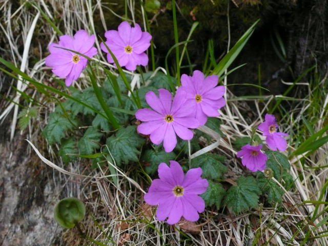 ハイマツ帯を抜けるとそこは橄欖岩が露出した岩場だ。ここが今回の登山の一つのハイライト部分である。それはカムイコザクラが咲く岩場である。Sakagさんのホームページを見て是非とも見てみたくて登った2007年の6月のときと同じように、岩場のあちこちに、登山道にもカムイコザクラがチシマノアマナを従えて咲いている。10日前ですでに盛期を迎えていたカムイコザクラも、蕾を付けたままのものもあって新旧混在、待ちに待った花見ができた。登山道に落ちて?根付いていた株も、踏まれることもなく花を付けて待っていてくれた。よかった、よかった!