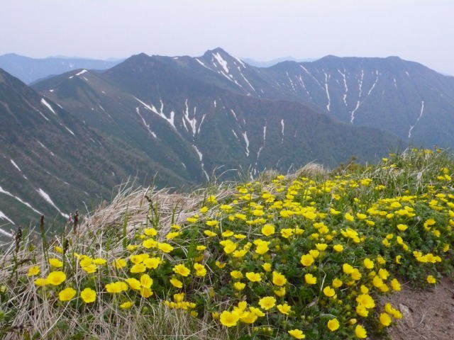 「羊蹄山、美瑛岳、トムラウシ山、ニペソツ岳、羅臼岳、斜里岳、雌阿寒岳、雄阿寒岳などを登ってきたのですが、まだずいぶんと時間があってこれからも北海道の山に登るのです。」と言うから「いいとこ取りの贅沢な山登りをされていますね。」と答える。そうすると「今年、2か月かけてヒマラヤに登ったのですが、日本に帰ってきたら山を選ぶか会社を選ぶかどちらかにしろ、と言われたので会社を辞めちゃったんですよ。だから時間は一杯あるんですよ。」という。なんと答えたらいいものか・・・。そんな湿っぽい話の結末ではあったが、戸蔦別岳の頂上はミヤマキンバイの黄色い花に彩られていて、華やいでいる。
