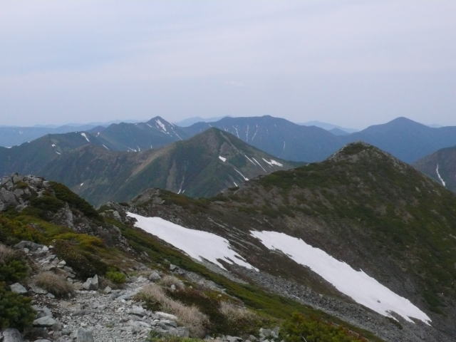 頂上直下、新冠側にテントが張れそうな場所が一つある。低気圧が日本海の海上とオホーツク海上にあると天気予報は言う。午後3時ころからは雨に変わるとの予報だが、空模様からはまだ持ちそうな感じを受ける。今夜には30mmのまとまった雨が降るので、明日のことを考えると、今のうちに戻れるところまで戻るのがいいだろう。30分ほど頂上に滞在したあとは、一目散で来た道を戻る。それにしても長い稜線だ。黙々と歩を進め2時間余で戸蔦別岳に届く。頂上は耐風姿勢を取るほどでもないが、それでもしっかりと歩かないとならない状況だ。頂上から下るとすぐに風雨が強くなる。