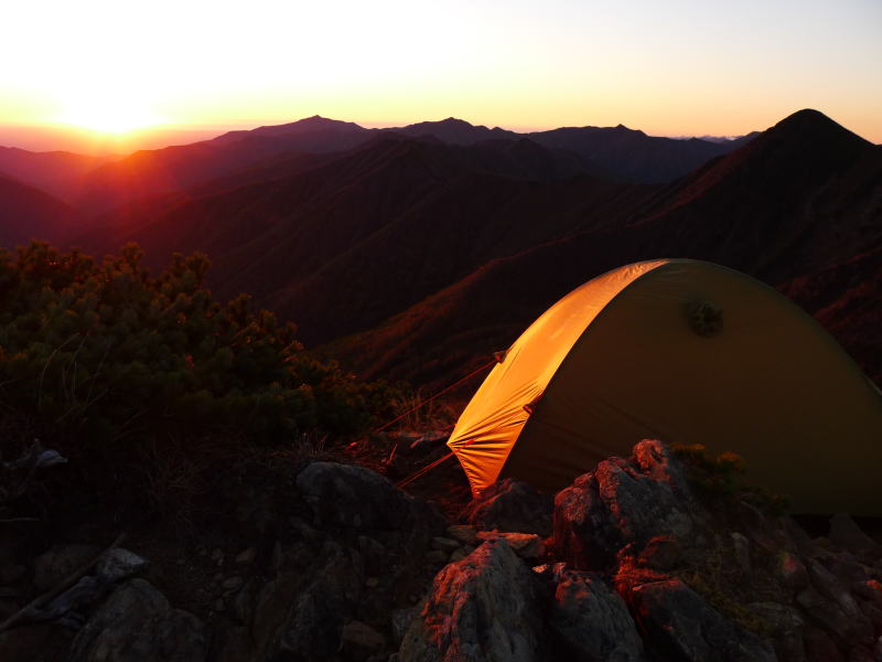 昨晩も早いうちに寝てしまったので、目覚めたのはまだ日が昇るのにまだまだ早い時間だった。御来迎を見ようと頂上で待つが、風は相変わらず強いので、風の当たらないピパイロ寄りの雉場で夜明けを待つ。いやはや、とんでもない景色だ。徐々に夜が明けてきたのでテントの風情をカメラに収め、再び雉場に戻る。