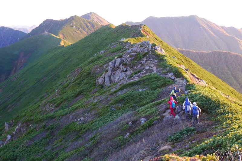 日高の絶景を堪能していると、なにやらにぎやかな声が聞こえてくる。テントに戻ろうとすると「○○さ〜ん。」と私の実名を呼ぶ人がいる。このホームページをご覧になっていて、テントと入山届から私を特定したとのこと。初めてお目にかかる方だったが、HYMLで承知している人とその仲間たちであった。日高の山のまだ夜も明けやらぬ時の思いもかけない出会いであった。1967峰に向かうという皆さんを見送る。