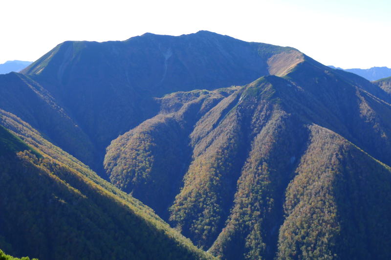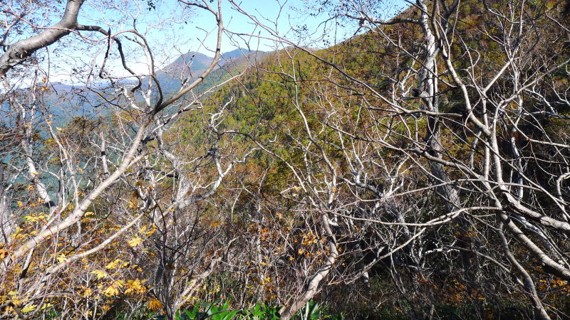ナキウサギが生息する岩場を過ぎるとハイマツと灌木の中を下ることになる。雪が残っているときにはルートファインディングに難渋するところだ。夏道を順調に進むと、往路の獣臭はまったくなくなっている。二岐沢まで続く急斜面の下りなので、用心しながら歩く。