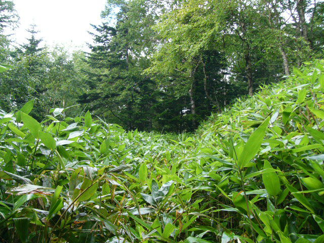 林道から別れ登山道(廃林道)を行くが背丈ほどのある熊笹が待っている