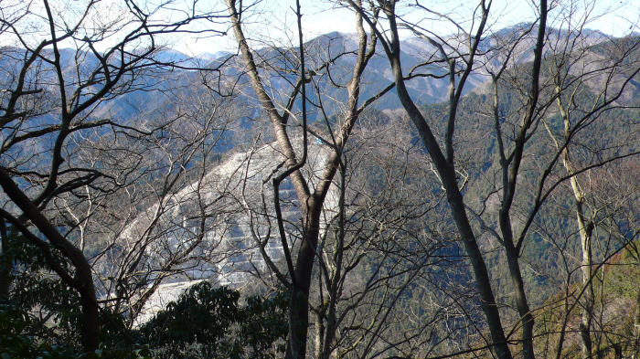 湯の沢の石灰石採掘場と奥に鳩首峠からの尾根
