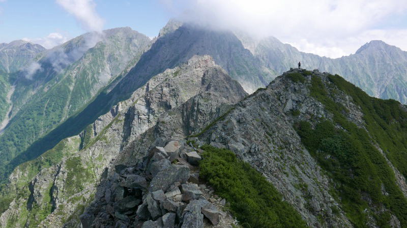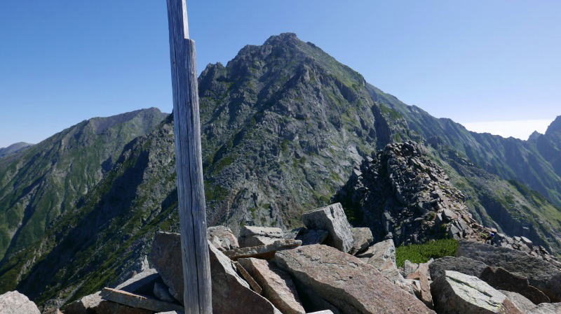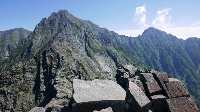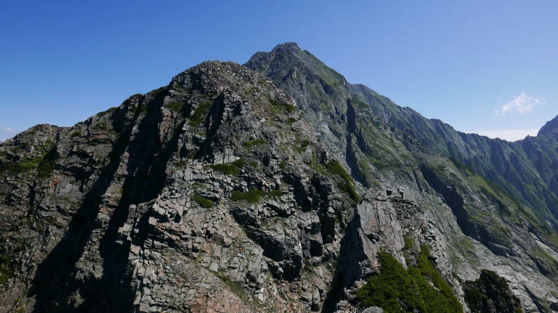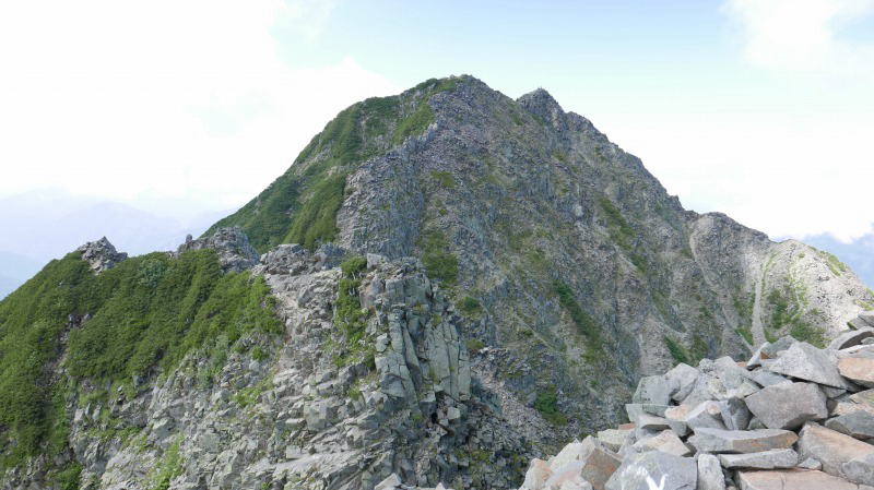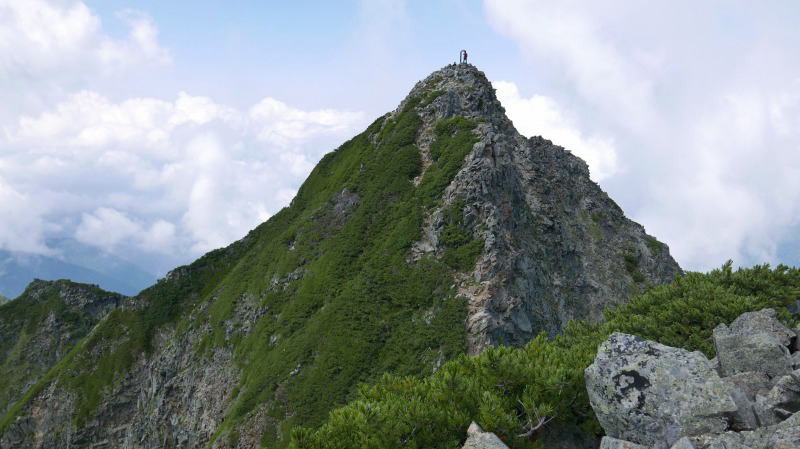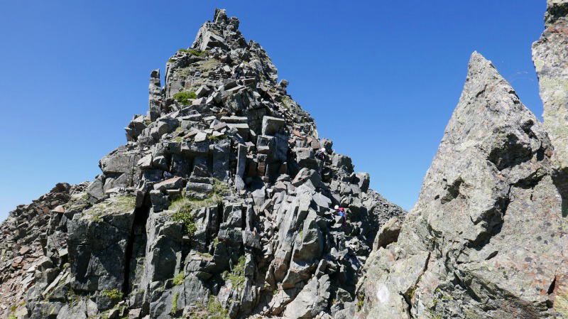 逆層スラブを下り切ると、間天ノコルとなる。休むことなく(自分にとっての)難関の間ノ岳の岩場に臨む休むことなく取り付く。あれ〜、前回どこかを巻いて登ったのかなぁと思ったが、それは取り付きの話であって、あとは背中を忠実に登っていく。登山地図に「垂直の岩場にクサリ」とあるように、傾斜角度はその表現に近くて正しい。しかし、足場はしっかりしているし、岩角をホールドするにも不自由がない。間ノ岳のピークから何人かが下りてくるのが見えたから、退避スペースを探す。