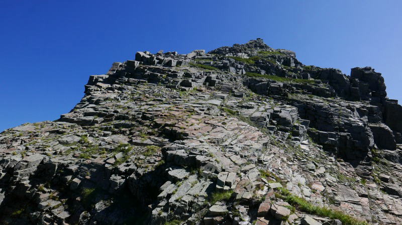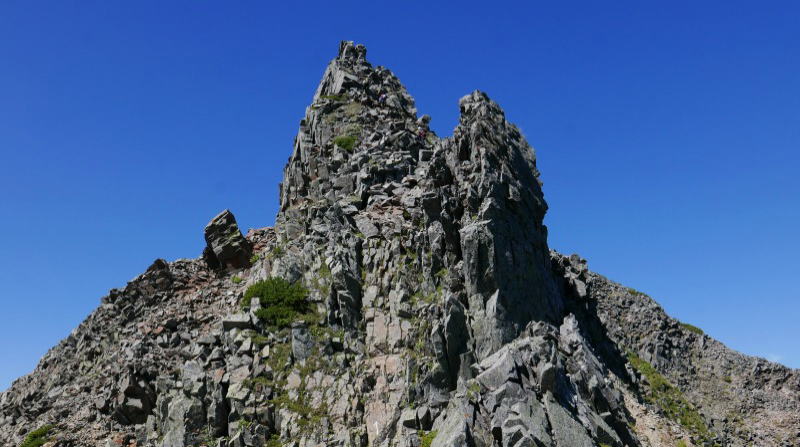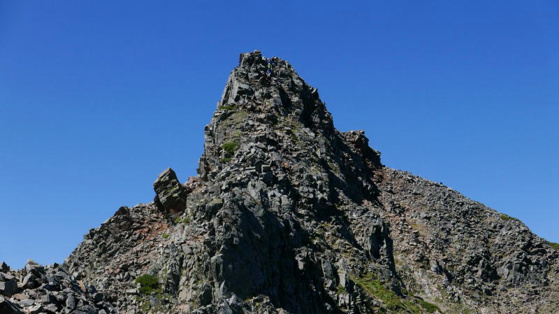 ジャンダルムを離れ天狗岳に向かう。天狗ノコルは天狗沢に道が分かれる。鎖が付けられた岩場を直登する。スタンスが広く多少の懸垂が必要なところがないでもない。あとは浮石を抱かないよう淡々と登る。要は闇雲に岩をつかんで力を掛けるのではなく、確認しながら力を掛ける。今回のジャンダルムで一つ勉強になったことがあった。誰もが手を掛ける岩の岩角には必ずと言っていいほどコバエが群れているということである。人間の皮膚が付着し、これをコバエの餌となっているようだ。そのような岩角は手垢で汚れ黒ずんでいる。