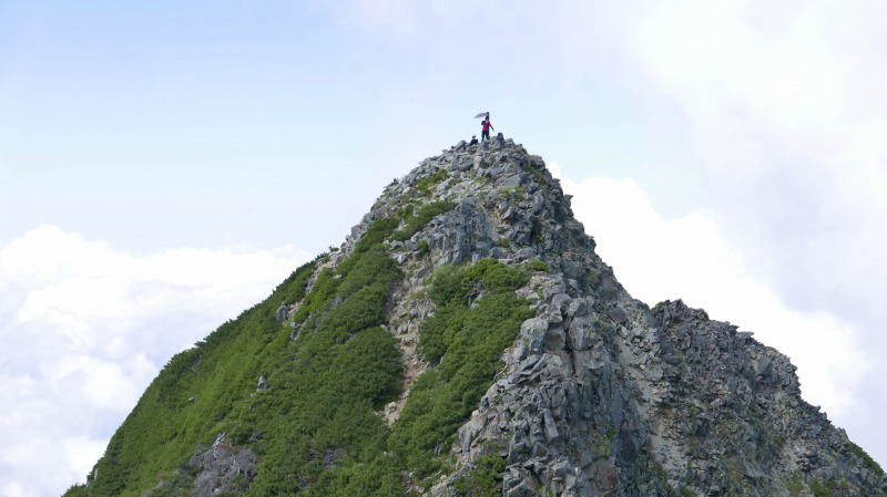 間ノ岳を過ぎると赤石岳だ。名前だけは南アルプスのようだが、南アルプスの間ノ岳と赤石岳にはそんなに難しいところはないはずだが、それでも死亡事故は発生している。そんな山で日傘を差している人が見える。
