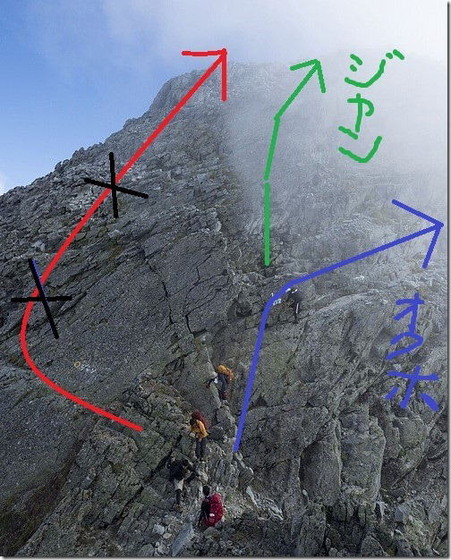 @ 奥穂高岳からジャンダルムに登る(西穂高岳側から)とき、飛騨尾根に入り込んでしまうおそれがあるからという理由で、果たして緑色の直登ラインを選択するだろうか。確かに鎖はある。