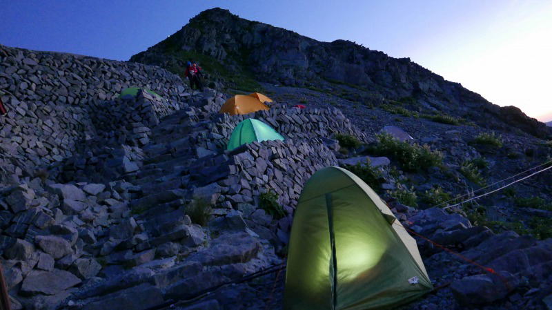 早朝の奥穂高岳のテント場で