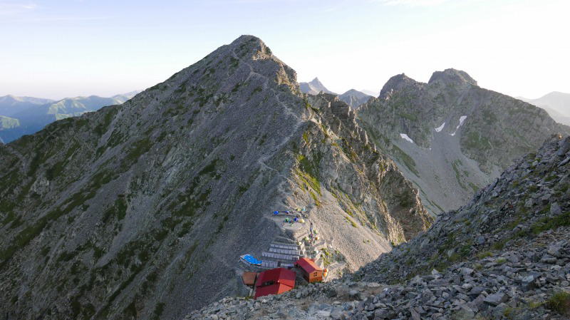 午前3時に目が覚める。テントの換気口から空を見ると満天の星が輝いている。ただし、風が強い。テントを震わせている。午前3時半に起きて簡素な朝食を摂り、撤収に取り掛かる。半数を超えるテントはもうない。今日は急ぎの旅ではないが、小屋に宿泊した人が朝食を済ませないうちに出発しないと、奥穂高岳への登りで大渋滞するのは目に見えている。