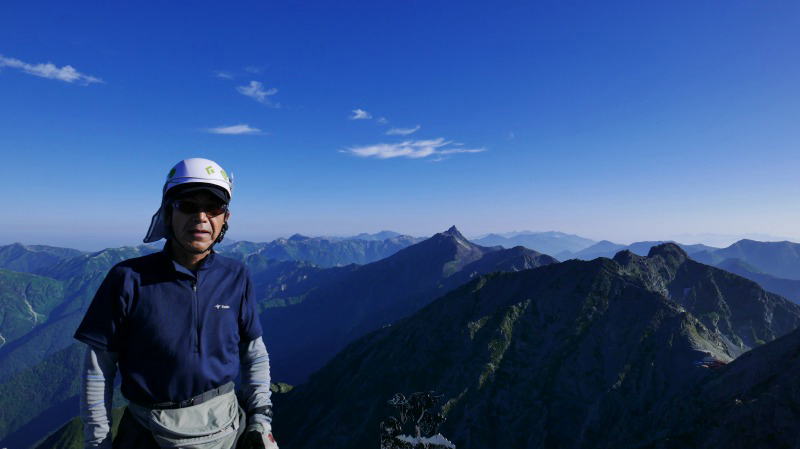 ジャンダルムのピークに立った人は、(老少年を除き)皆いい顔をしている。槍ヶ岳を背に写真を撮って上げたり 撮ってもらったり。ジャンダルムはさっさと切り上げるつもりが、30分近くもいてしまった。眺望はいいし、次にいつ来られるか分からないからまあいいか。