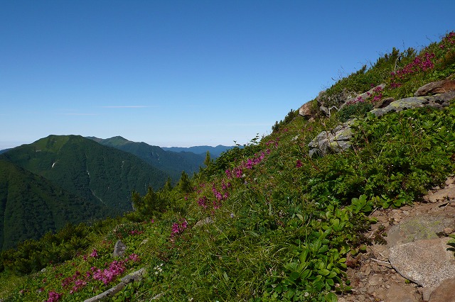 案の定、何度もこの稜線でそのような場面に出くわす。また、十勝側の笹薮で道が薄くなったり見えなくなった場合は、もともと笹で道が明瞭となっていなかったところに笹の伸長で道が消えかかっているのだから、そのまま突き進むとまた明瞭な道が花畑の中に見えてくる。