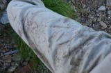 藪漕ぎには結構な時間がかかった。体力も消耗した。使うのは脚だけではなく両手も総動員である。日高の山の藪漕ぎに軍手は必携だというが、安物の軍手は2つ必携だと言わなければならない。ズボンも松脂だらけ、お気に入りのOSPREYのブルーのザックも何もかにも松脂だらけである。ここまでで脚の脛には傷が相当付いている。あちこちが痛い。結局、この後の藪漕ぎもあってズボンは使い物にならなくなった。 1日も経たないのにハイマツの脂はこの有様である (6) |