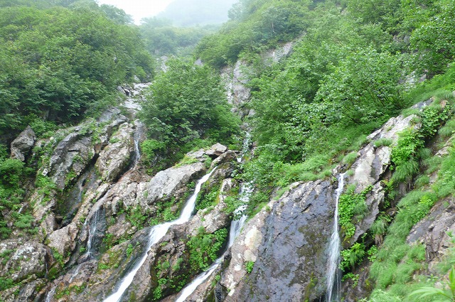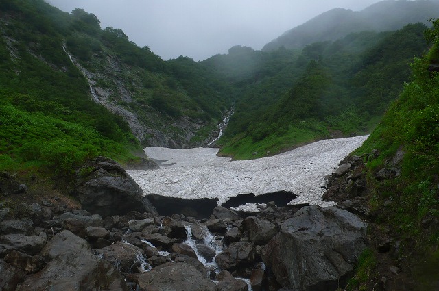 雨は引き続き落ちてきているが、雨量自体はそれほどでもないと思われ、三股までの難路もやっと下りると一安心といった床ところであった。三股の雪渓の下流にも大規模なデブリがあった。