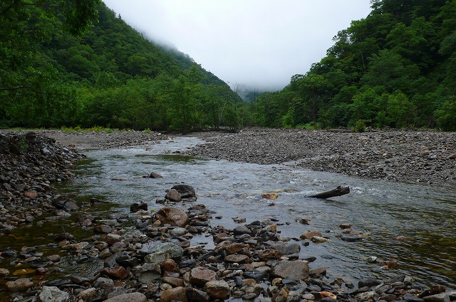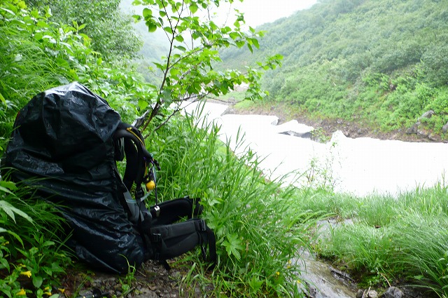 ときどき雨が強く降ってくるが、長くは続かず、沢の水量に影響を及ぼすものではなかった。ピンクテープを拾いながら河畔の踏み跡を辿ったり、沢をそのまま進んで行くうちに、八ノ沢出合のテント場を見落として札内川に出てしまった。