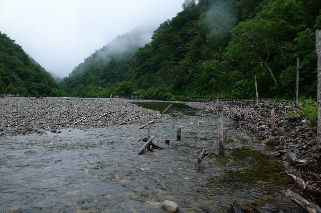 淡々と札内川に沿って歩いているうちに徐々に流れは平坦となって、出発から5時間後の午前9時40分に堰堤に着いた。このとき、やっと今回の縦走が無事に終わったことに安堵を覚え、安全な登山に終始したことを感謝した。