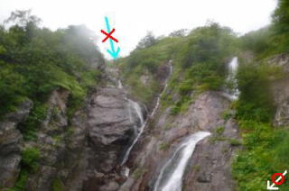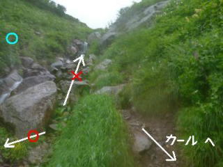 | カールから矢印に×の沢を下りると右の画像の×に出る。矢印に赤丸がある方向に戻ると、右手に草場に入る踏み跡がある(正解)。 | → | 左の画像の沢を下りると、矢印に×のところに出る(矢印の先に2人がいる)。ここは画像の2倍程度の高さがある。矢印に赤丸がある方向から下りてくる(正解)。 | ||