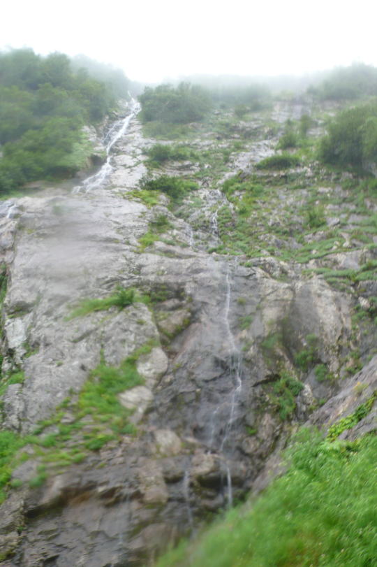 こうして難関を抜けて、雨の中デジカメを出して滝を写していると、なんとビバークしていた2人が滝の上部から下りてこようとして、こちらに声をかけている。大声を出し、「駄目だぁ〜、戻れ〜。」と叫び、手でバッテンを作り、ステッキで本来の方向を示す。しかし、下りようと下ってくる。警笛(ホイッスルと呼ぶものではない。金属製でコルクが入ったもの。)を何度も強く吹いて、叫ぶ。「下りるなぁ〜。」「だめだぁ〜。」と。ようやく戻って行く姿を確認できたので、下る。