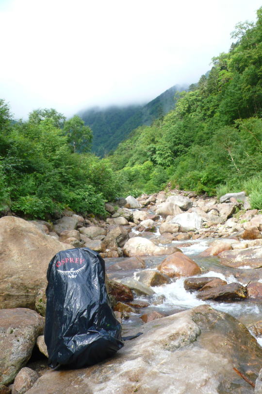 午前8時15分、八ノ沢出合のテン場に着く。オレンジ色のアライのテントが張られている。先の2人のものだろう。無事の下山を願う。午前10時、ようやく7ノ沢出合に到着する。すると、河原で甲羅干しをしている男性が見える。昨晩、テントに入らないかと声を掛けた男性だ。「暗くなってしまい、自分のテントを張った場所が見つからず、ビバークしました。」という。ビバークと言っても、降雨の中、木の下で寝れたかどうかだろう。携帯電話がほとんど通じない山中においてラジオでの気象情報入手、濃霧の中でのGPSでのルート確認、光量があって照射距離が長く電池の持ちのいいヘッドランプでの登路照射、小型ラジオでの気象情報入手は不可欠であることを再確認した。