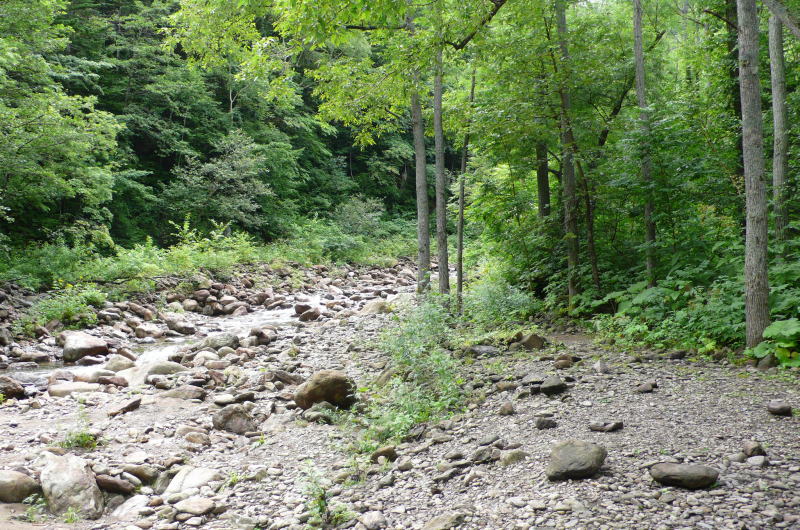 慰霊碑から続く流れに沿ってこのままこの沢(画像左)を下りると、急な滝に出て |