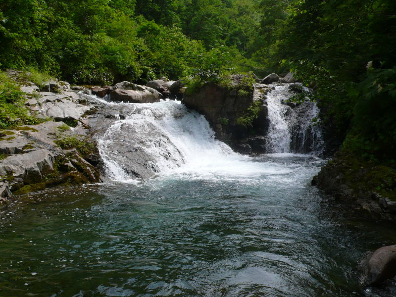 搭乗の朝一番のJAL便は、1時間近い遅れで「とかち帯広空港」に着いた。迎えの中札内ハイヤー(0155−67−2053)に乗って中札内市街に入り、森田商店でガスカートリッジを購入する。そのまま戸蔦別林道に入り、6号えん堤のゲートで下車。このゲートは昨年はなく、エサオマントッタベツ川に沿って土場までは入れた。ゲートで身支度を整える。昨年より1時間遅れの午前11時55分、沢靴に履き替えてえん堤から入山ボックスが置かれているエサオマン林道分岐へと向かう。