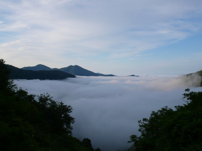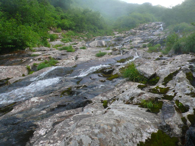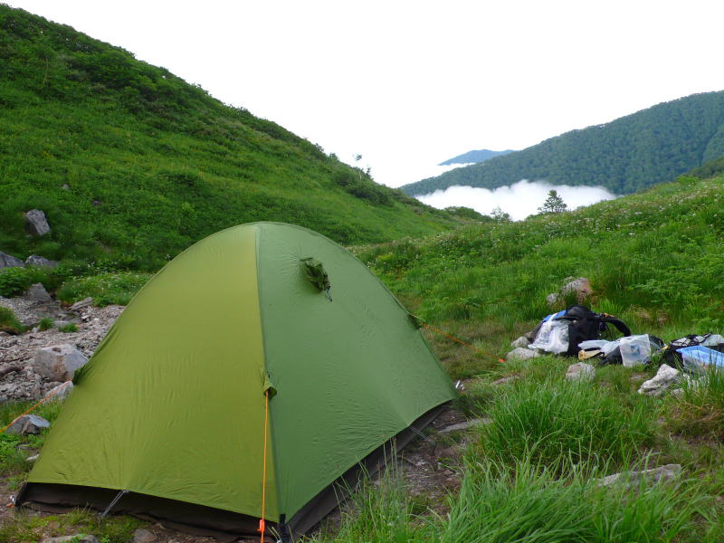 もう午後4時だというのに、ようやく997mの出合に届いたばかりだ。巨石を乗り越えながら長い滑滝の下部に着く。今年は雪渓は残っていない。トカチフウロやヨツバシオガマ、ヒダカアザミの群落に見送られながら滑滝の左岸を登る。この滑滝は2〜300m続くが、慎重に登れば難しいところはない。約30分後の午後6時20分、ようやく北東カールを望むことができるお花畑に着く。カールの雪渓はほとんど残っておらず、ヒグマの気配もないが、先行者もいない。静寂のカールから振り返れば、雲海がすっかり十勝平野を覆っている。気温は12度。明日の札内岳JPへの登路を確認する。これを怠って明朝、ガスにでも巻かれればやっかいだ。午後8時には爆睡!