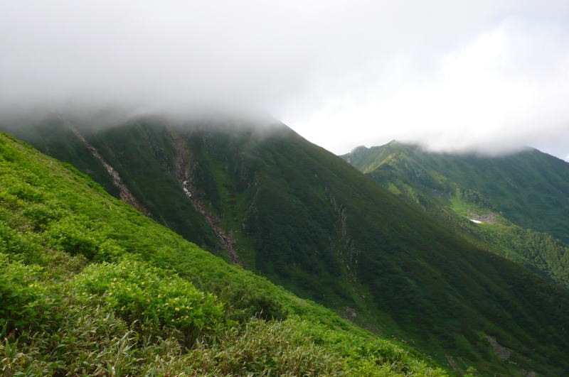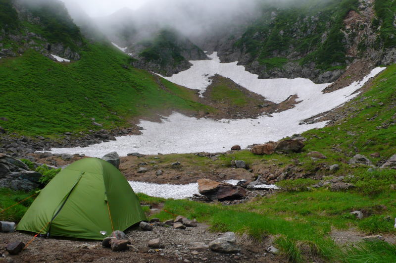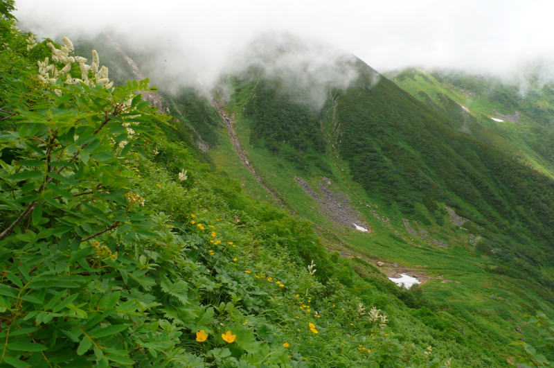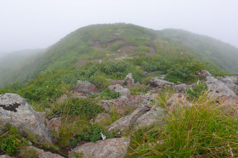 一晩中雨は止まなかった。テント内で聞こえる水の流れの音も激しい。今日は、ガイド登山のメンバーが上がってくる予定の日だが、よくて八ノ沢出合で停滞だろう。10時を過ぎ、雨からガスに変わってきた。このまま一日をテントの中で過ごすのも芸がない。明日の天候によっては縦走を諦め、下山を考えなければならないのかも知れない。ならばカムイエクウチカウシ山とピラミッド峰をそれぞれ往復してこよう、時間はたっぷりあるとゆっくり出発する。(10:40)