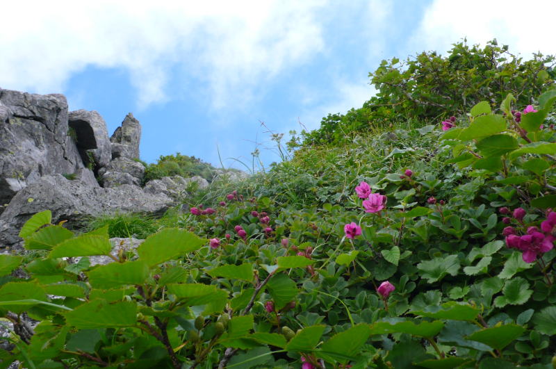 ヨツバシオガマ、ミヤマダイコンソウ、エゾツツジ、ミヤマリンドウ、ミヤマキンバイ、シナノキンバイソウなどの花々に見送られて、念願のピラミッド峰の頂上に着く。(11:55) NHKが2001年に取材したカムイビランジはこの山で撮影したはずと、目を凝らすが結局登山道からは見ることができなかった。とある岩場で見つけたたった一塊のカムイビランジはまだ開花には早く、今回の「やま旅 はな旅」の大きな目的であった、その華麗なピンクの花にお目にかかることはできなかった。