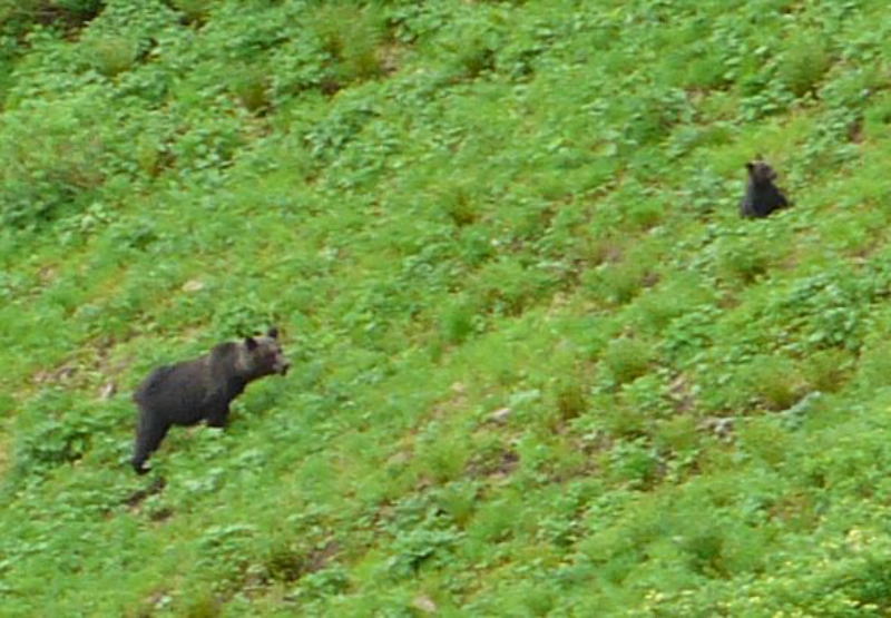 1年ぶりのカムイエクウチカウシ山の頂上に立つ。(14:50) 頂上直下のテン場からエサオマントッタベツ岳へと続く道は、通う者も少ないと見えハイマツに覆われている。しばらくの間頂上で待つが、ガスでいつまで経っても展望がきかないので頂上を後にする。咲き残ったチングルマのある花畑から切り立った稜線を越え、1700mの分岐に着くと、今度は子連れのヒグマがピラミッド峰の北東斜面で草を食んでいる。なんとも言えない北海道の山らしいのどかな光景である。ただ、子連れの熊であることや距離があることから、余分な刺激を与えないように熊鈴を鳴らすことなく、静かに脇の登山道をカールへと下りる。(15:35)