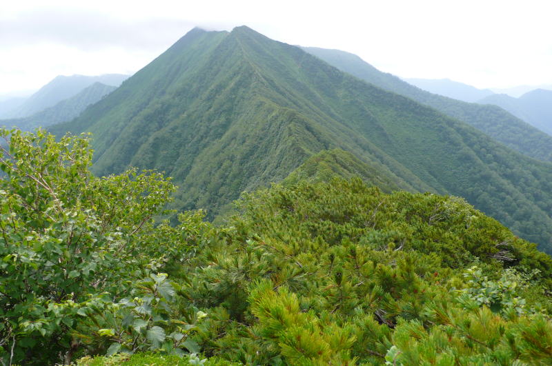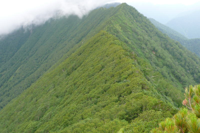 1640mからはもう何も考える必要もない。ときおり密生したハイマツの下にある踏み跡を探り当てられず、乗っ越すべき場所を直進したり、崖の脇のスベリ落ちるような踏み跡を延び放題に伸びた太いハイマツの枝に邪魔されながら慎重に進む。しかしペテガリ岳からヤオロマップ岳を歩いたときの1600m付近でのような緊張感はなく、いわば義務的に淡々と、しかしかなりの抵抗を得ながら先へと進む。したがって水の消費も多くなり、結局、カールから1823峰までの間に2リットルを使ってしまった。最後のほうはブドウ糖をなめることによって唾液の産出を促して喉の渇きを減ずる。