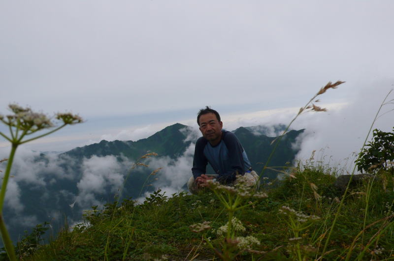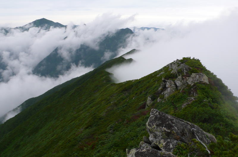 1602mのコルを出て登りにかかる。少し行くともうそこではおびただしいハイマツが待っている。1640mのピークまで1時間も掛かって登ると、その先はさらに酷い藪となっている。メモには「ヤブ最悪」と残されている。結局09:35に1602mのコルを出て1737mのピークのテン場に着いたのが14:15だから、結局この間を移動するのに4時間40分も要している。途中鮮烈なオオタカネバラのピンクの花や咲き終えたミヤマハンショウズルに迎えられたのが慰めである。(リンクはブログへ)